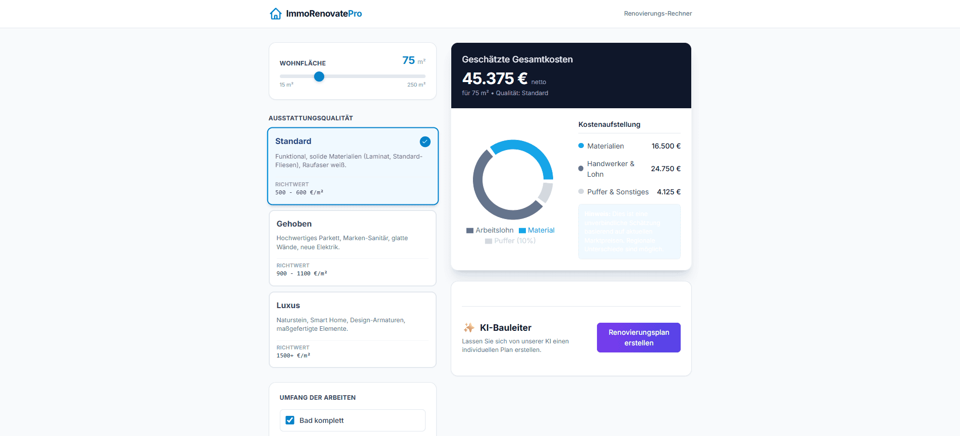 "Erstelle einen Renovierungs-Rechner für meine Makler-Webseite. Der Nutzer soll die Quadratmeter eingeben und die Qualität wählen (Standard, Gehoben, Luxus). Dann soll der Preis berechnet werden."